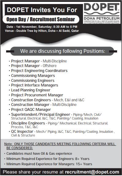 أعلنت شركة الدوحة للإنشاءات البترولية، عن إقامة يوم مفتوح للتوظيف لضم موظفين جدد للعمل بالشركة، في المجالات التالية: