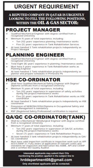 أعلنت شركة مرموقة في قطر، عن طرح فرص عمل شاغرة لديها في قطاع النفط والغاز، وفق المسميات التالية: